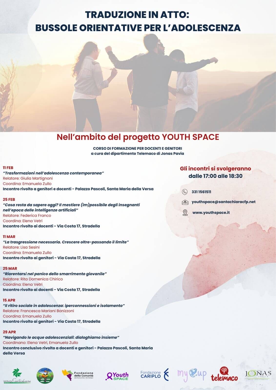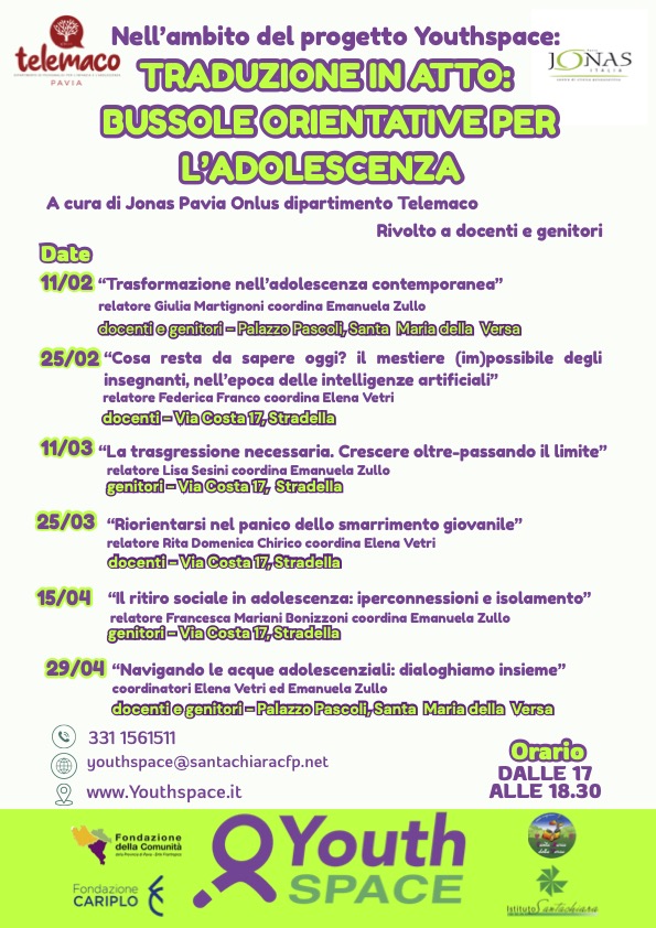 Jonas e Telemaco Pavia propongono due corsi di formazione, scanditi in 6 incontri, rivolti agli adulti che, a diverso titolo, affiancano il soggetto pre-adolescente e adolescente durante il percorso di crescita, con l’obiettivo generale di offrire degli strumenti per riconoscere i segnali di malessere o sofferenza psicologica nei ragazzi e per intercettare precocemente il disagio e le condotte a rischio.